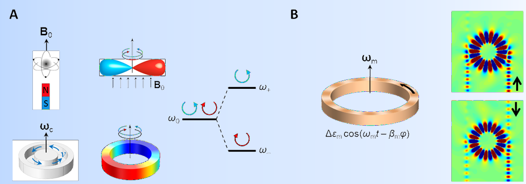 Like magneto-optical materials, an azimuthally symmetric ring cavity supports pairs of degenerate counter-rotating resonant states (a).